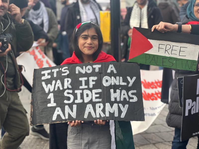 I think a lot about that film. About the little girl who died. About that girl from Réunion. About the people I know who have died violently. Who gives permission to tell the stories of the dead? I think about another girl. I met her during a protest march in London in 2023, days after the war in Gaza began. She waved at me, and her mother realised I was a journalist and insisted we take a picture with her sign. It read: It’s not a war if only one side has an army.